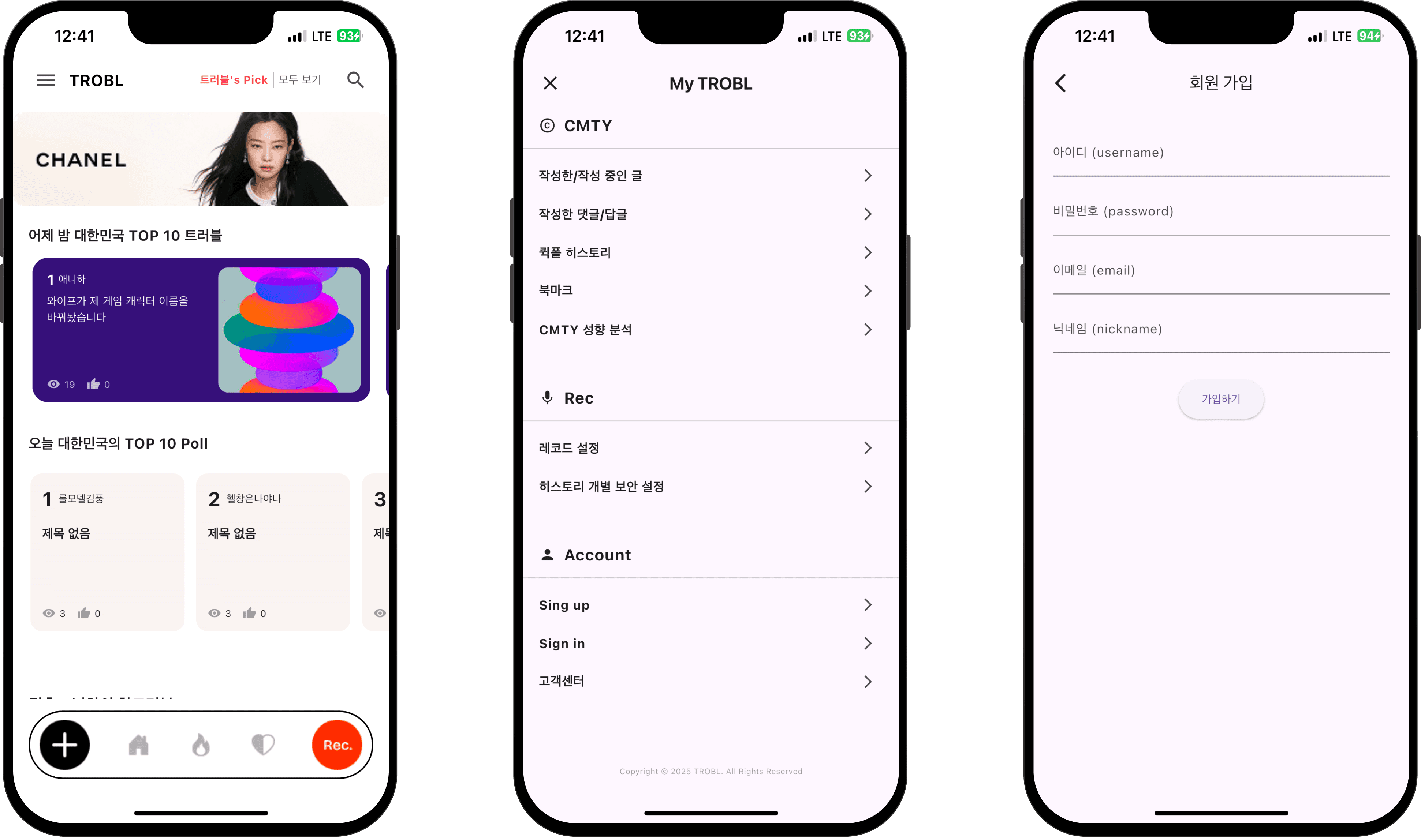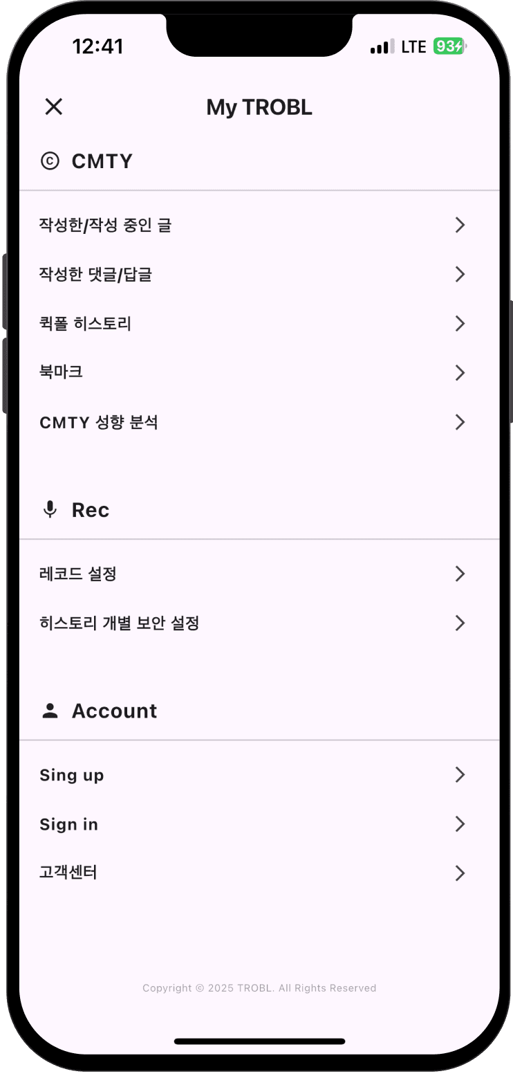 왼쪽 위 TROBL 로고 옆 메뉴 버튼 터치
